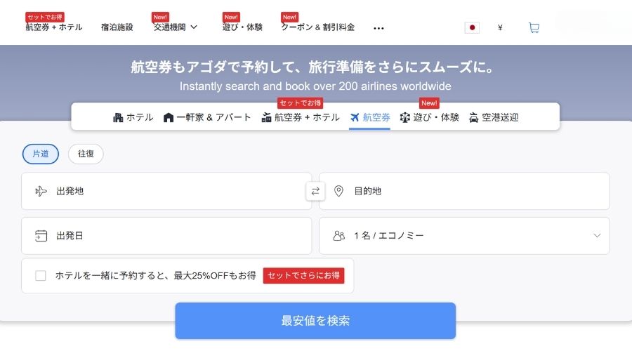 agodaは宿泊施設の予約だけでなく、航空券の予約も可能なオンライン旅行予約サイトです。